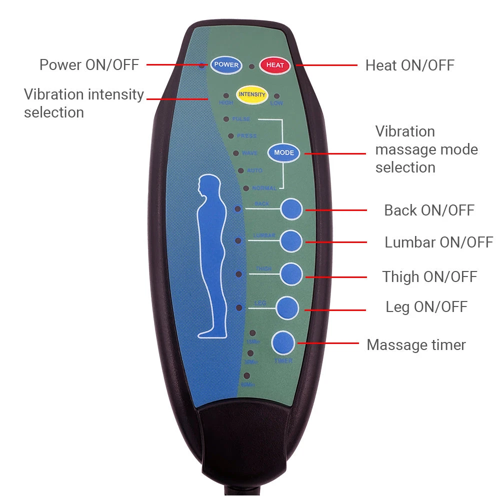 - Four Vibration massage areas: Turn ON/OFF the massage on the back, lumbar, thigh, leg area separately for maximum comfort.